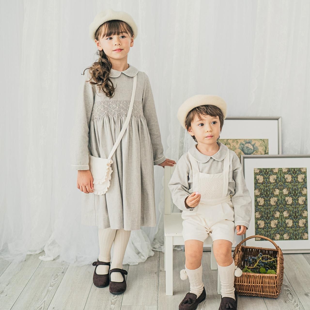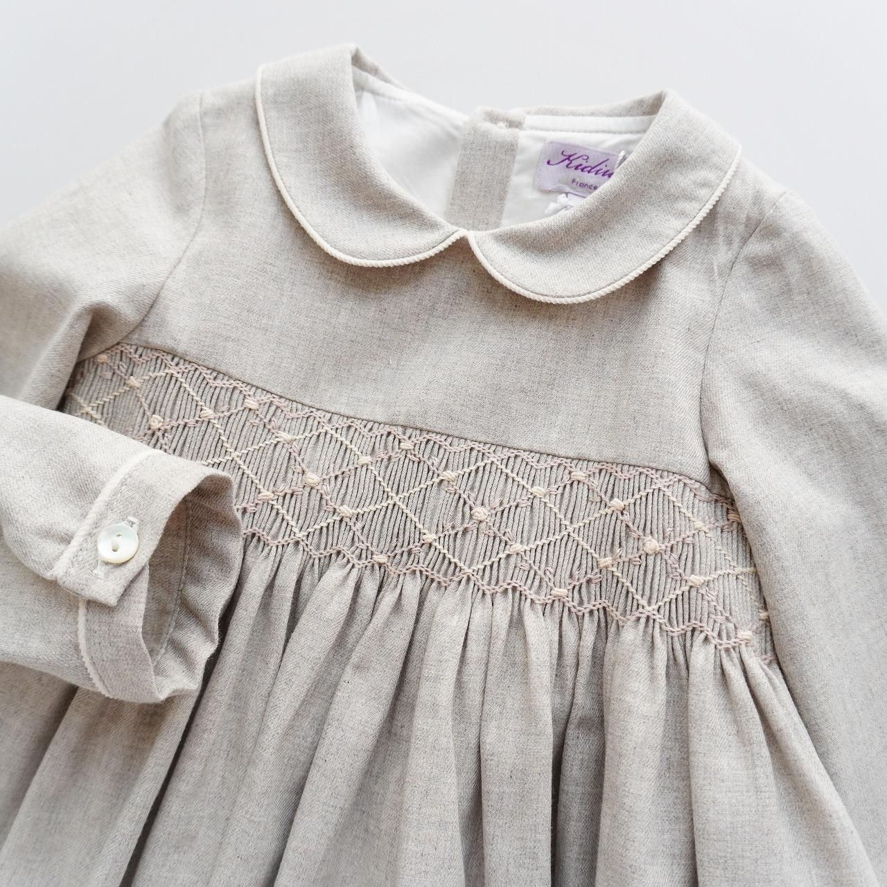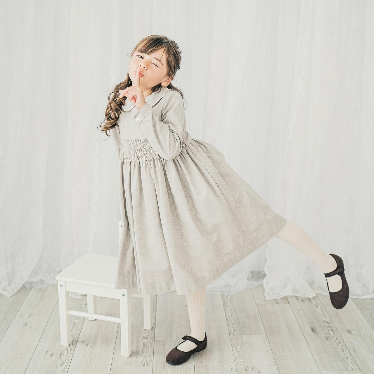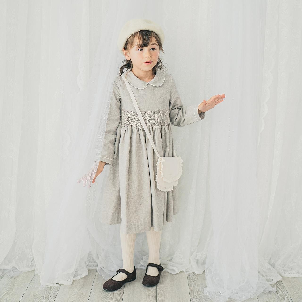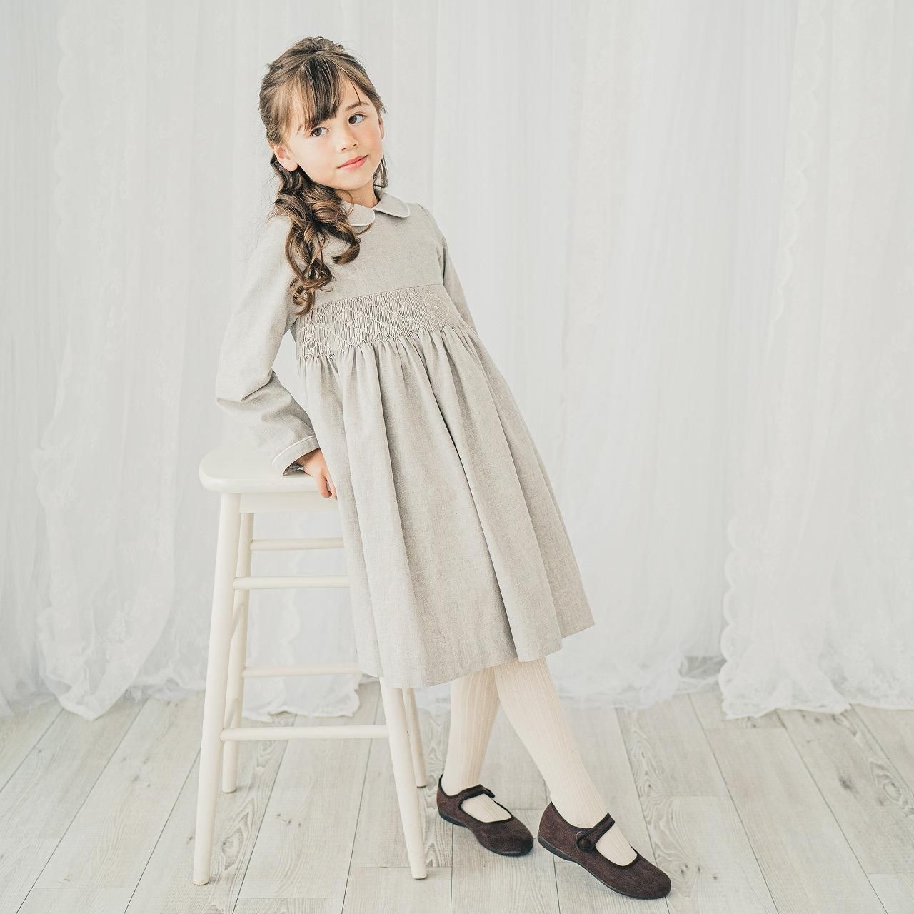 同色のハンドスモッキングの贅沢さが存分に味わえる一着です。