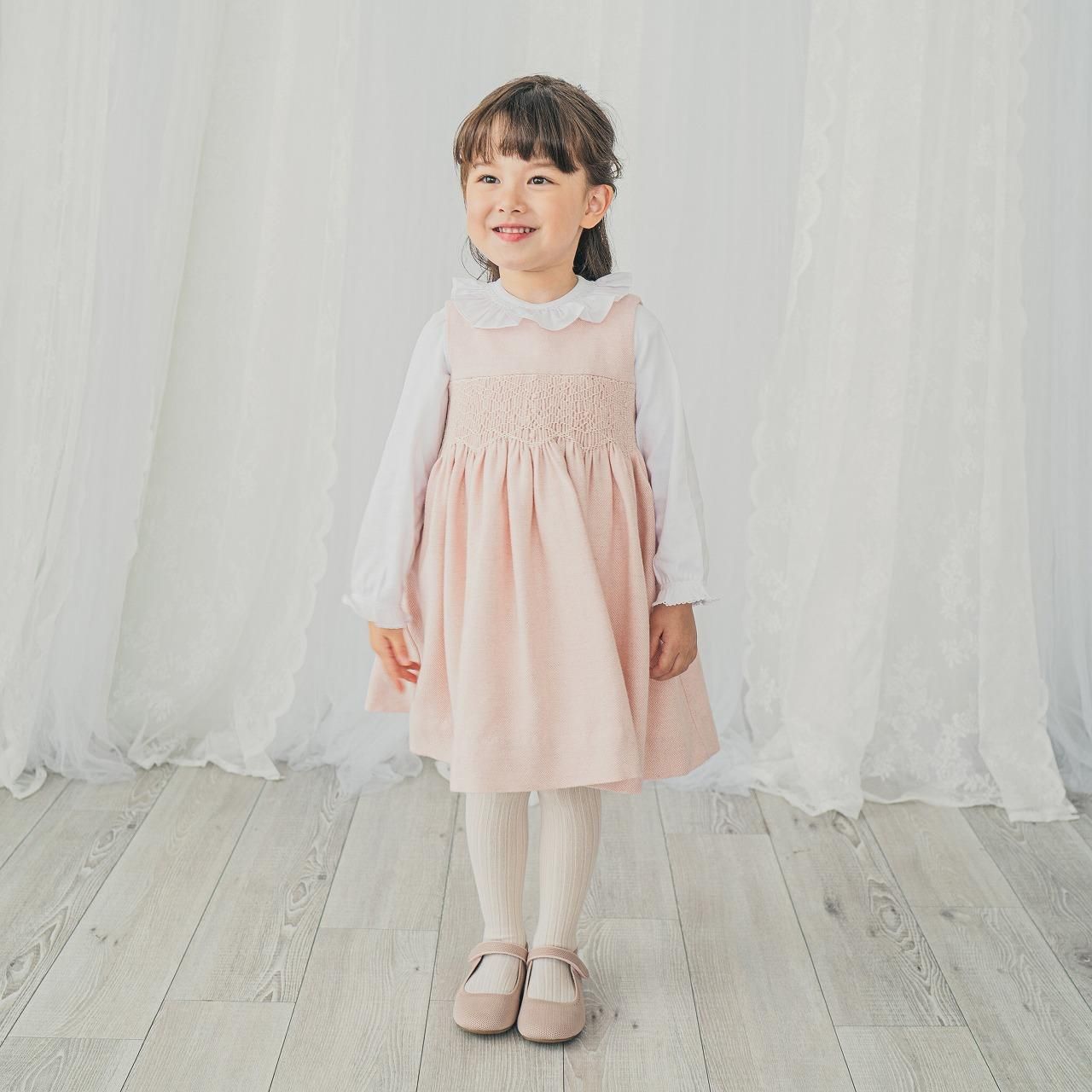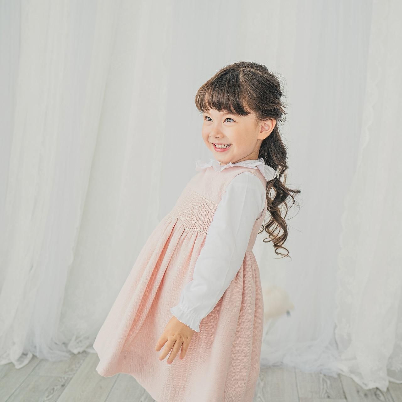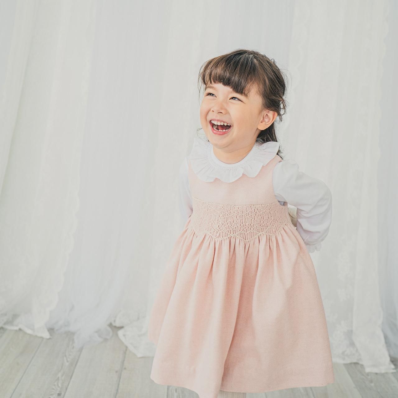 淡いピーチピンクの愛らしさと、ウールの入ったヘリンボーン生地が温かみのあるジャンパースカートです。