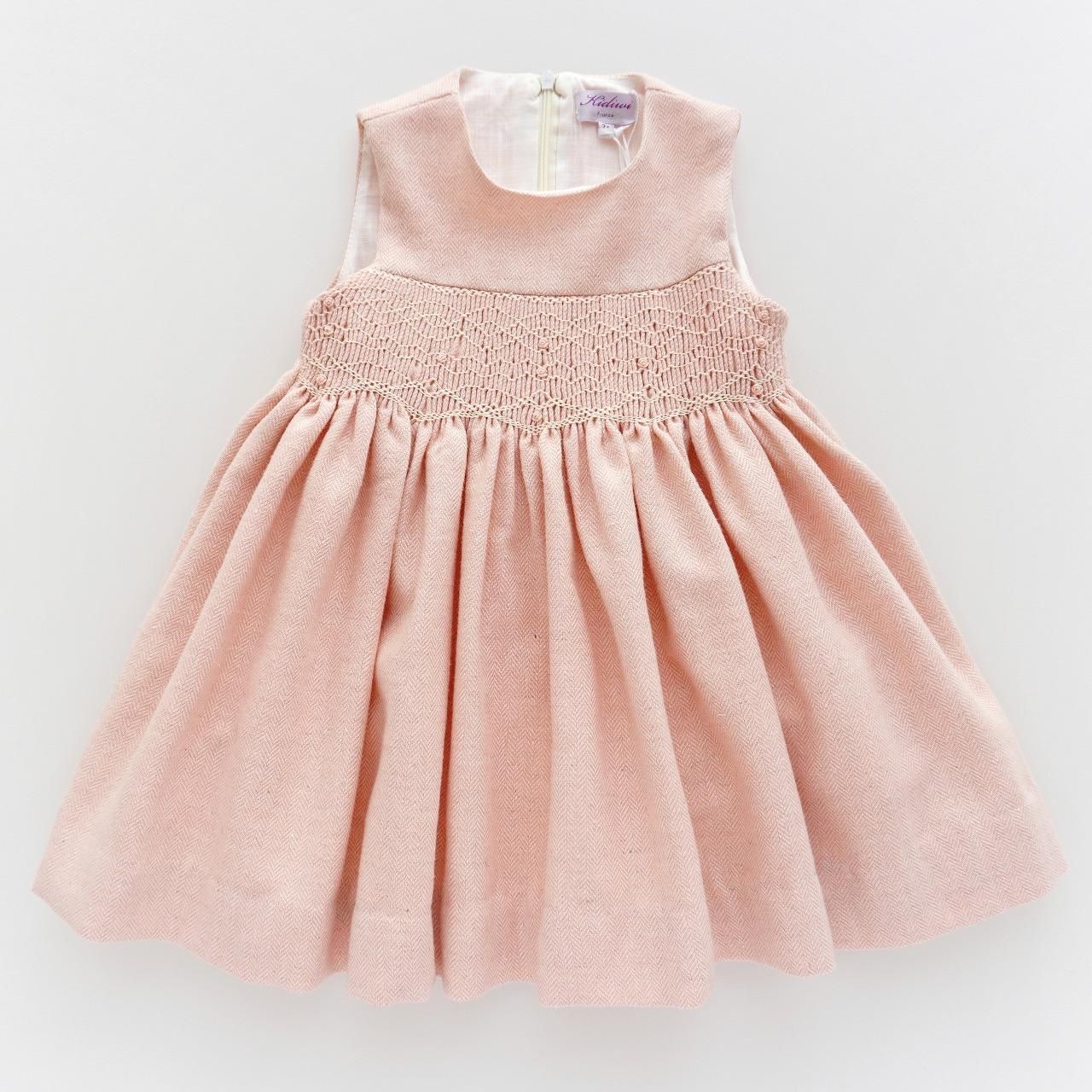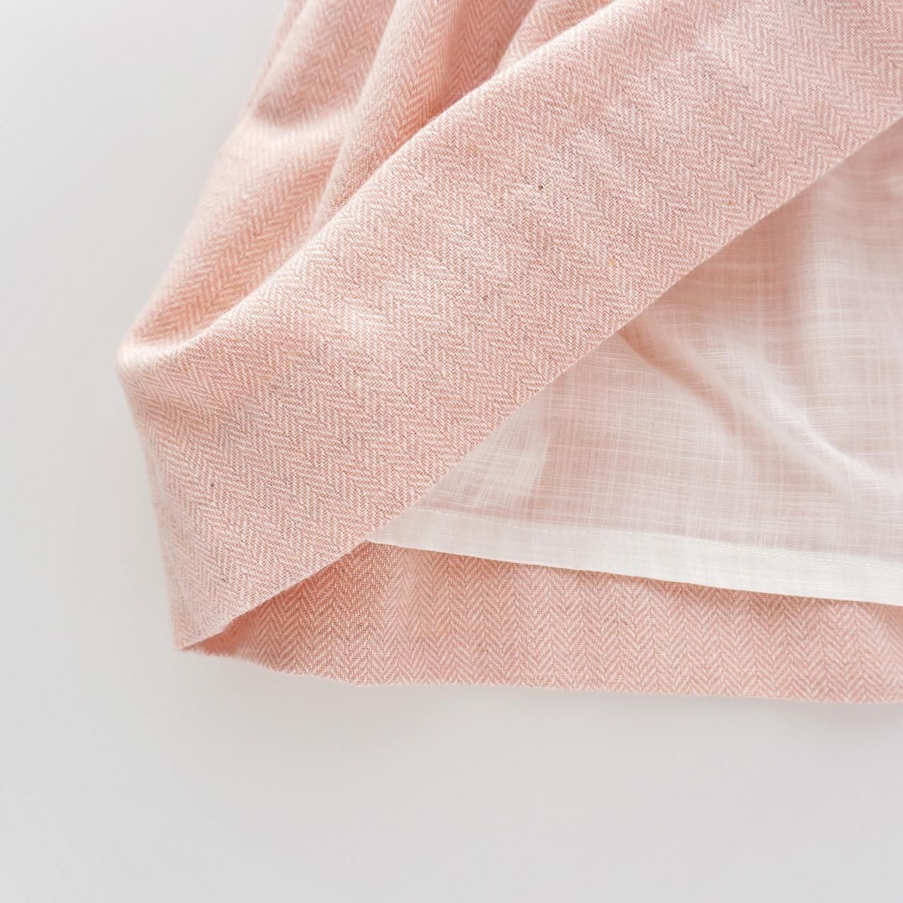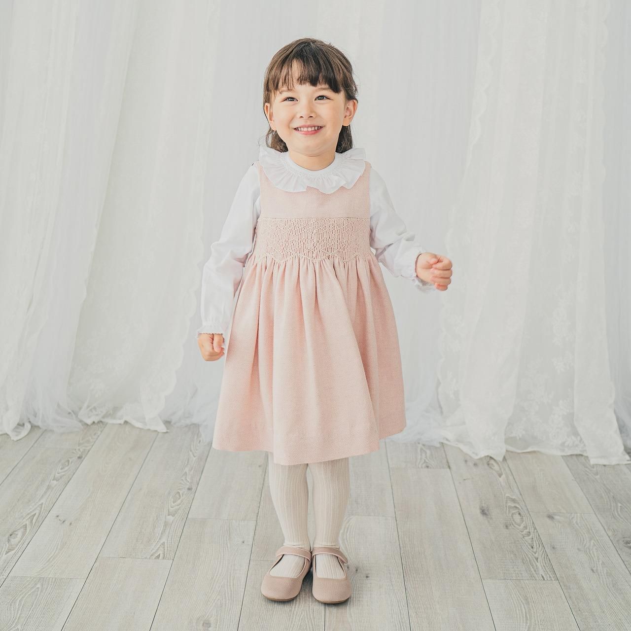 淡いピーチピンクの愛らしさと、ウールの入ったヘリンボーン生地が温かみのあるジャンパースカートです。