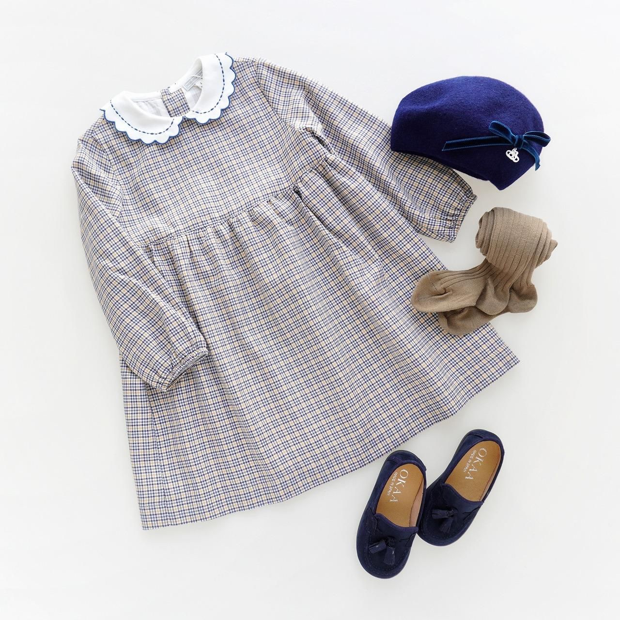 ベージュとネイビーの細かなチェックは、少しトラッドなイメージも残しつつ、