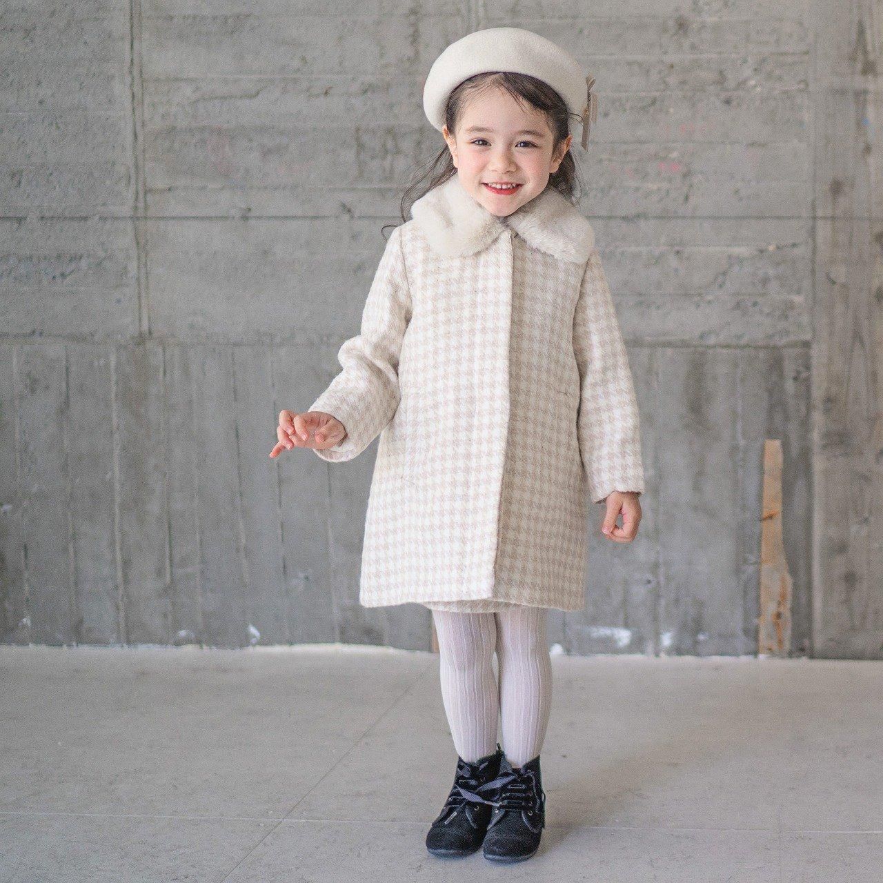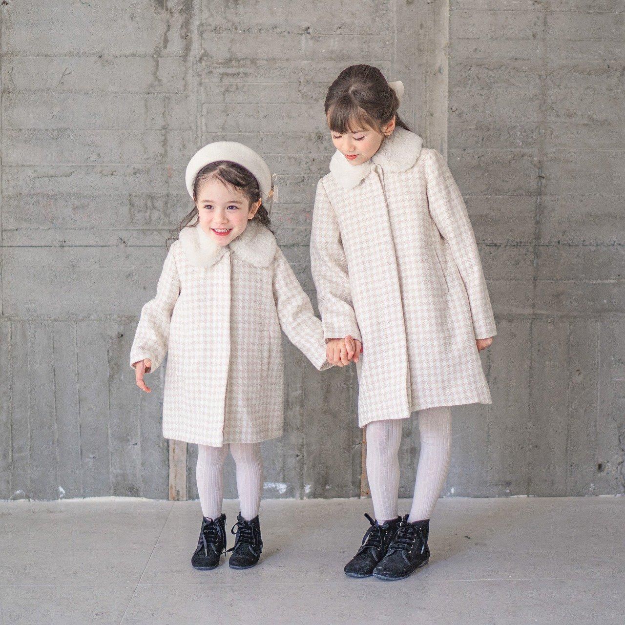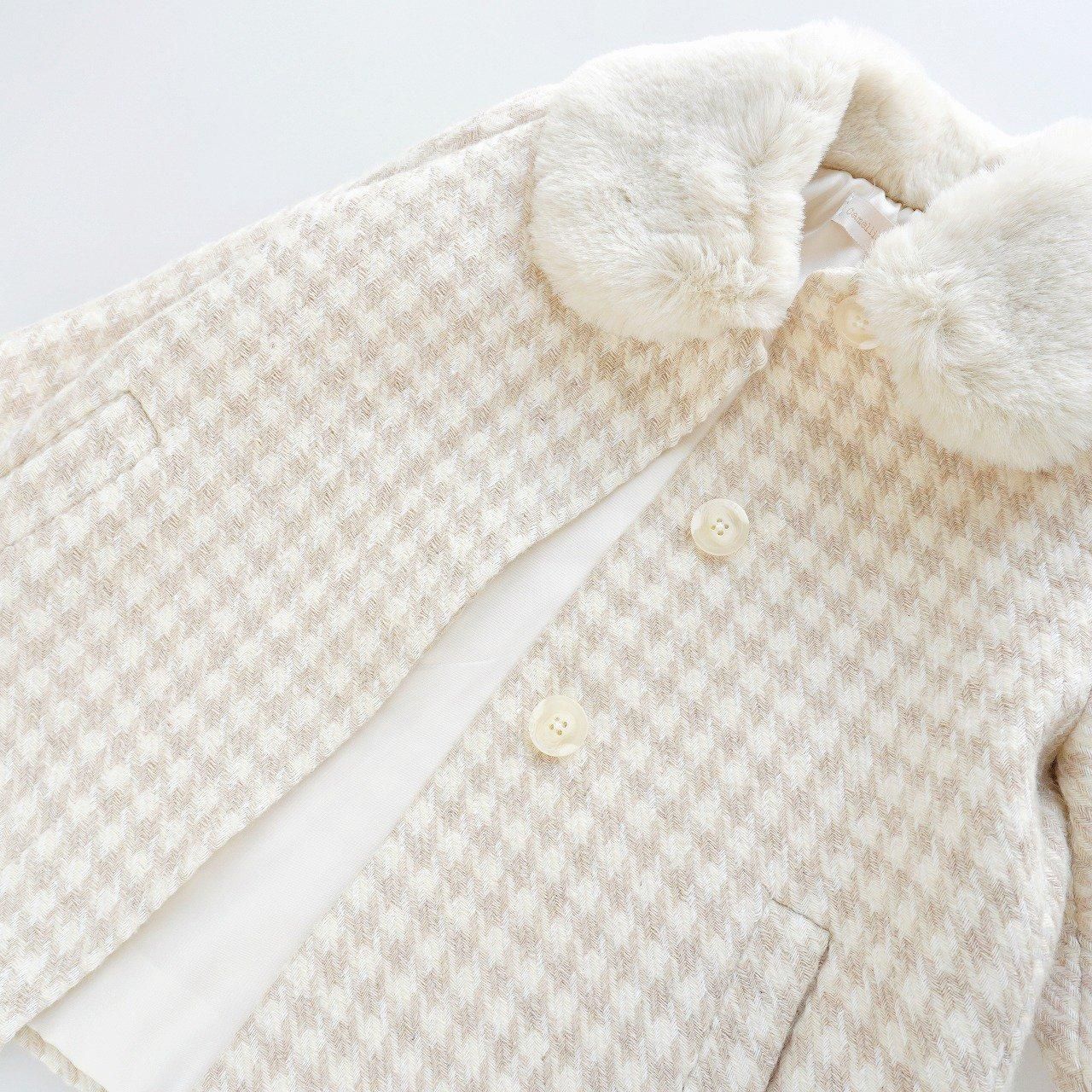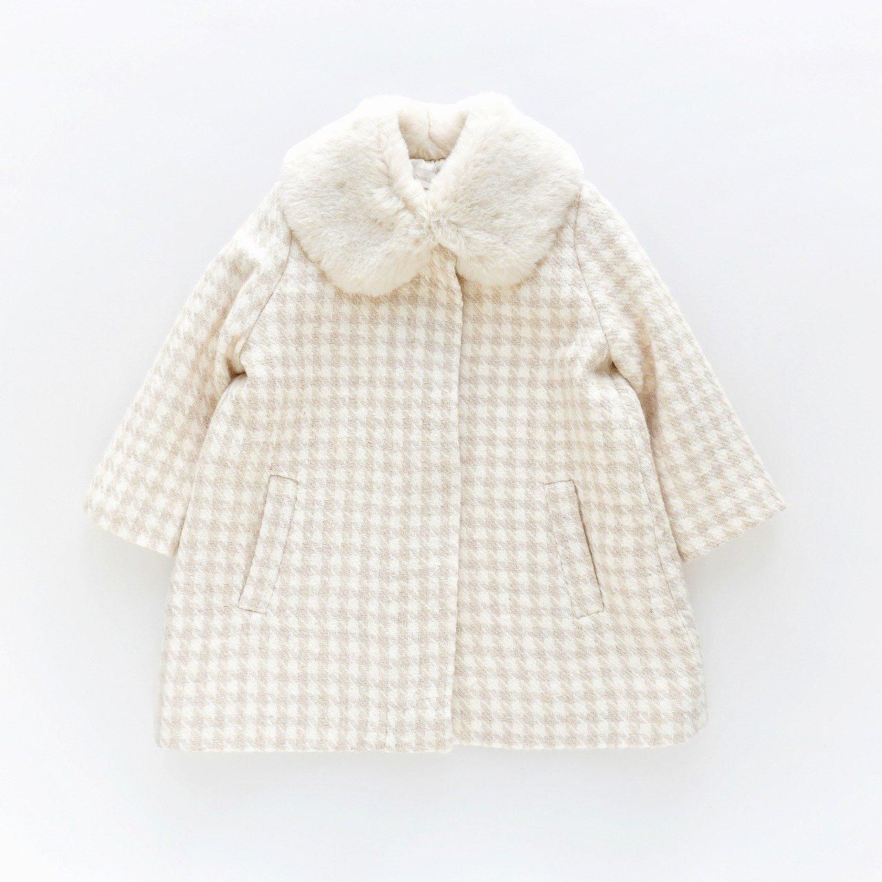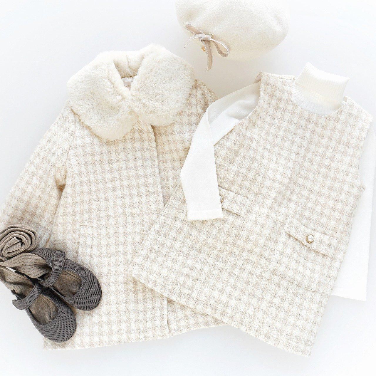 オフホワイト×淡いベージュの大きな千鳥格子がかわいらしいコートです。