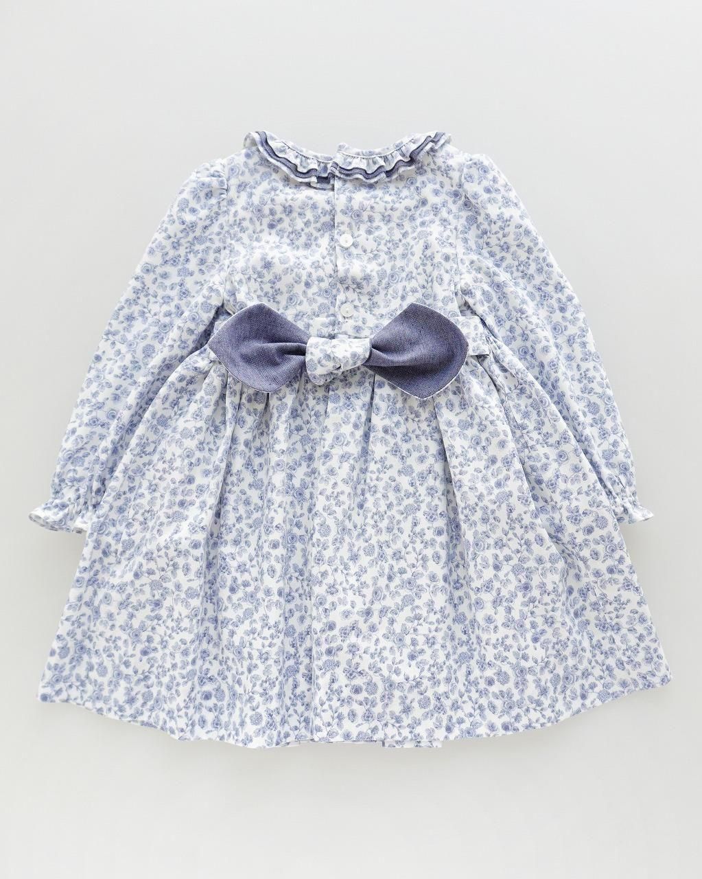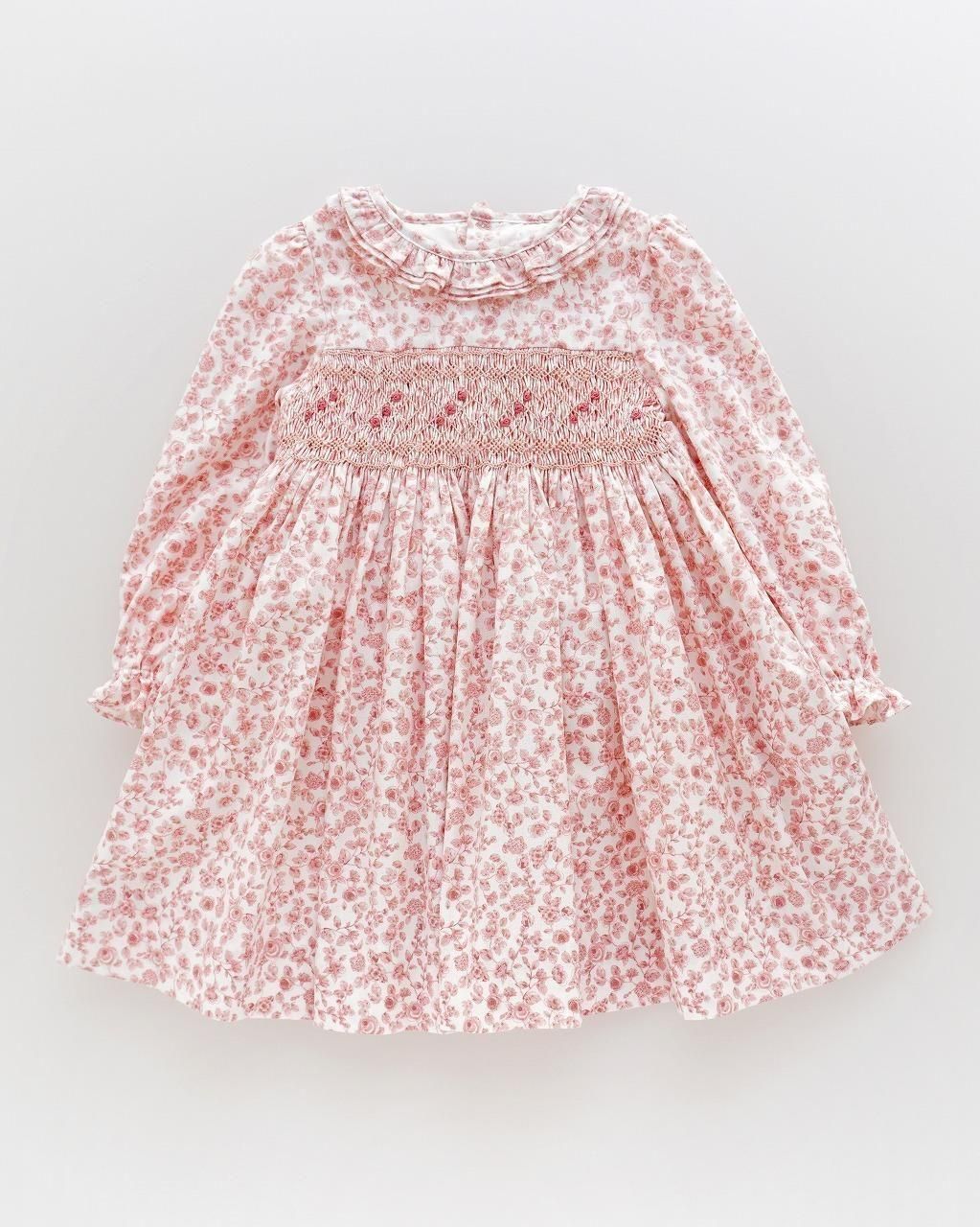 細かく繊細な野バラ柄のツイル生地を使用したワンピースは、