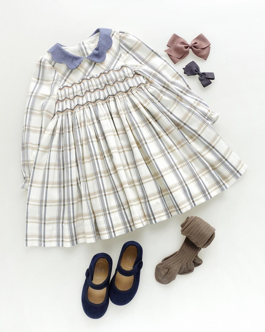 ミルクティーブラウンとデニムカラーのタータンがかわいらしい一枚。