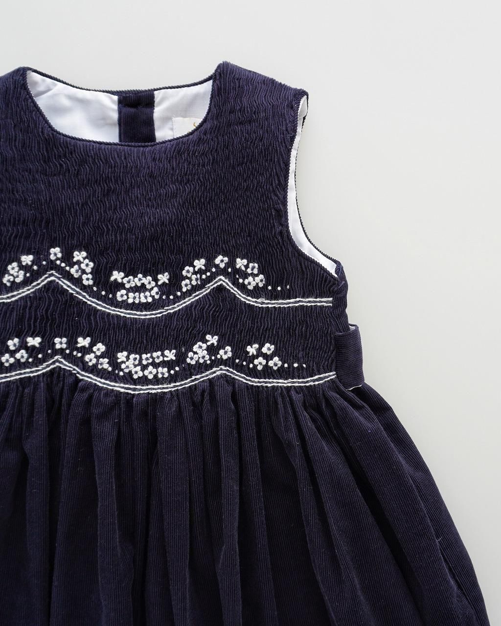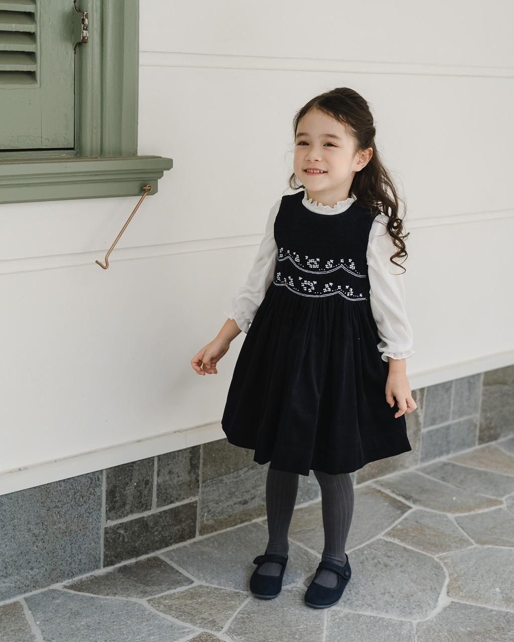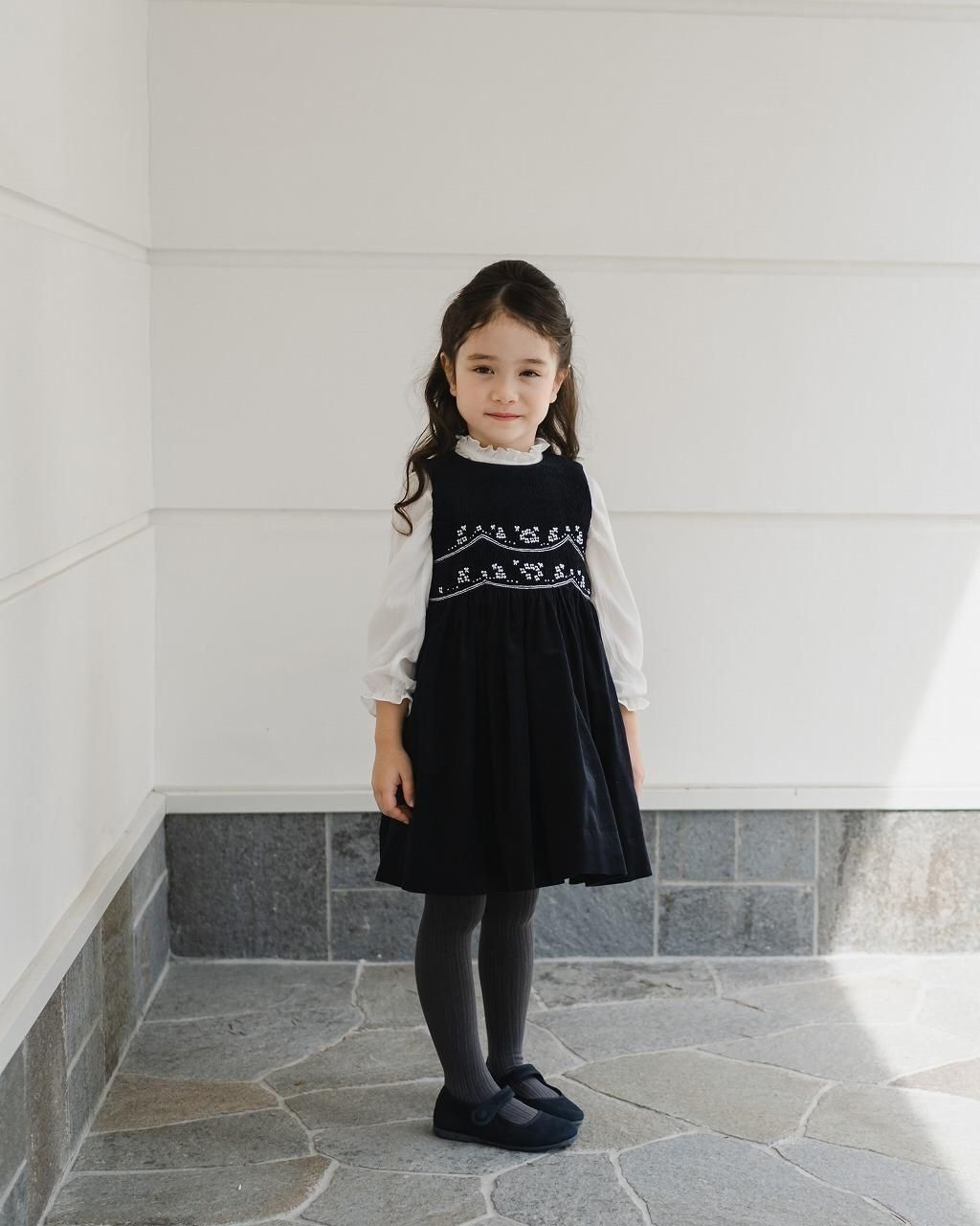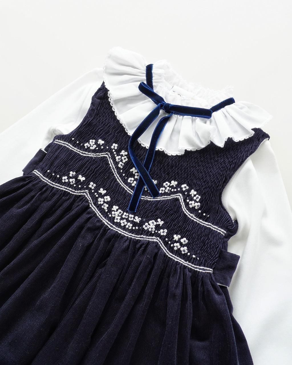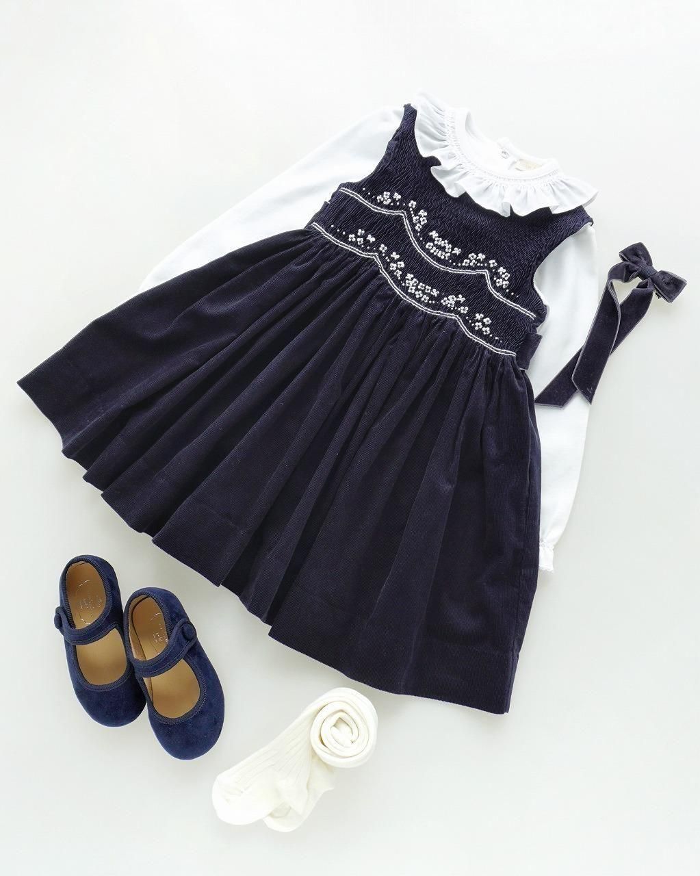毎年人気のネイビーですが、今年は身頃全体にスモッキング刺繍のはいったジャンパースカートをチョイス。