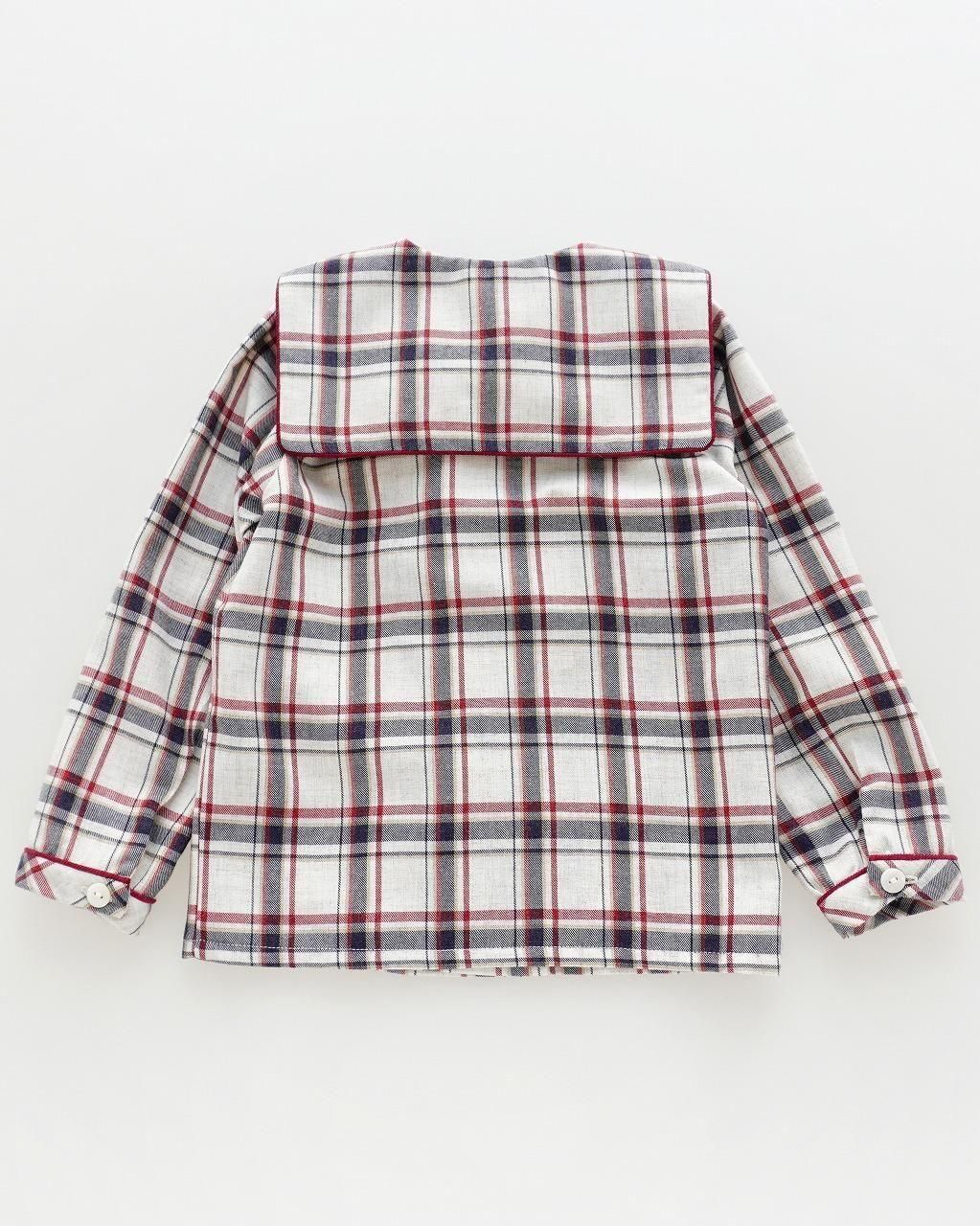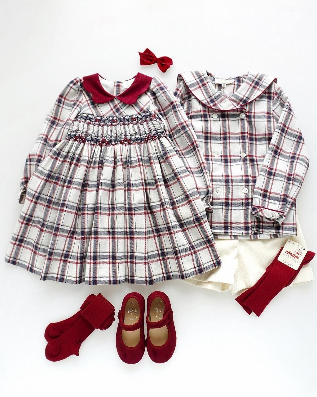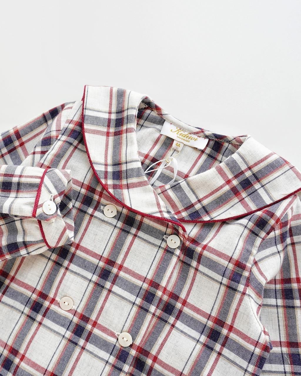 やわらかな淡いグレーをベースに、バーガンディとネイビーのタータンがとっても素敵な一枚。
