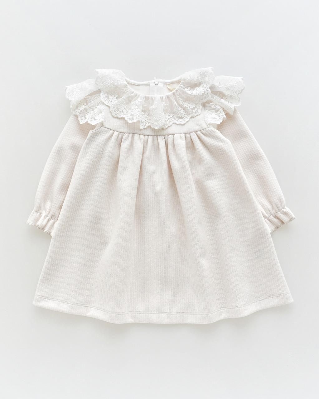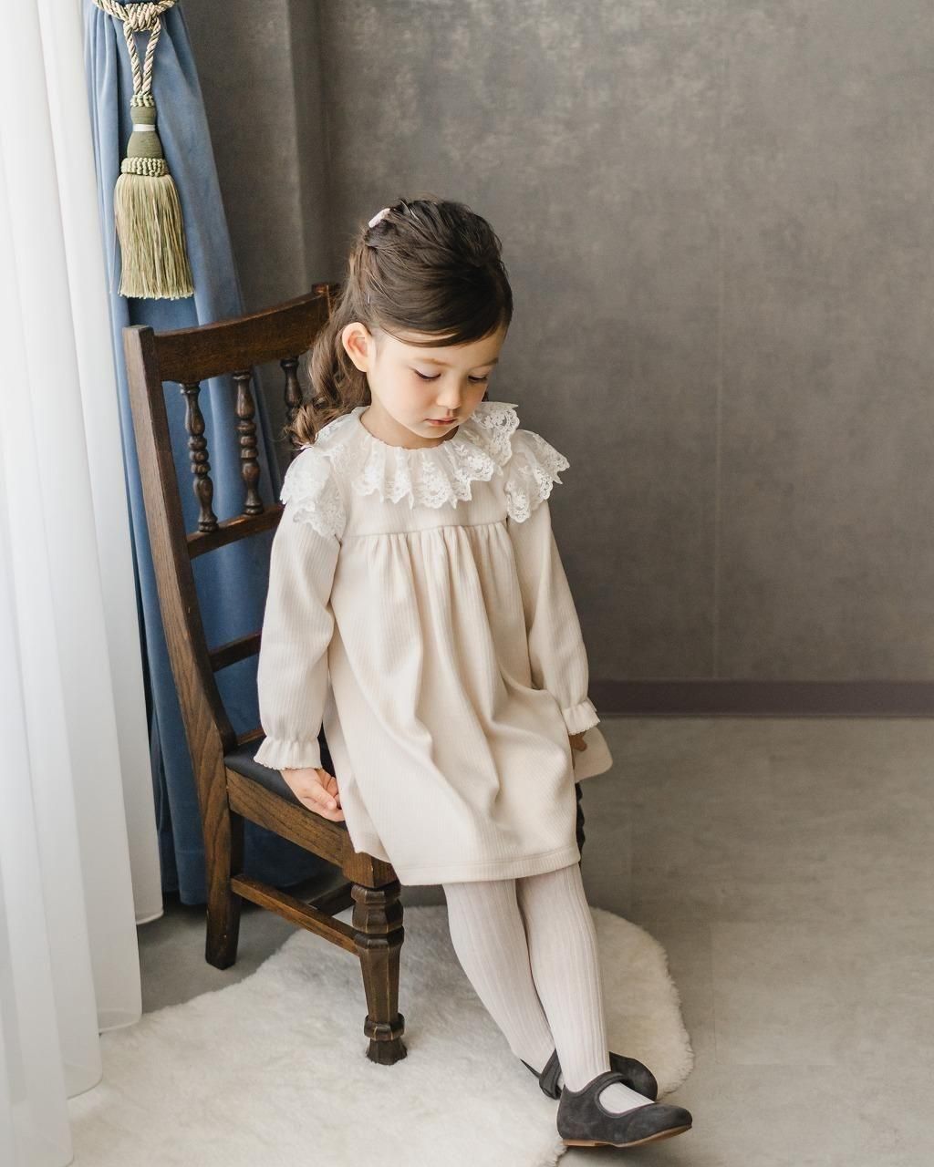 ヨーロッパならでは の、美しレースを、フリル襟とショルダーフリルに使用しました。