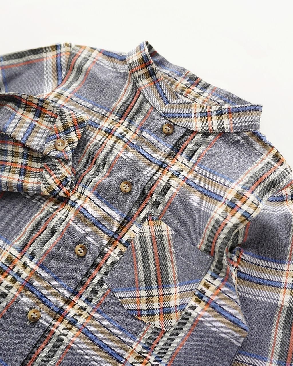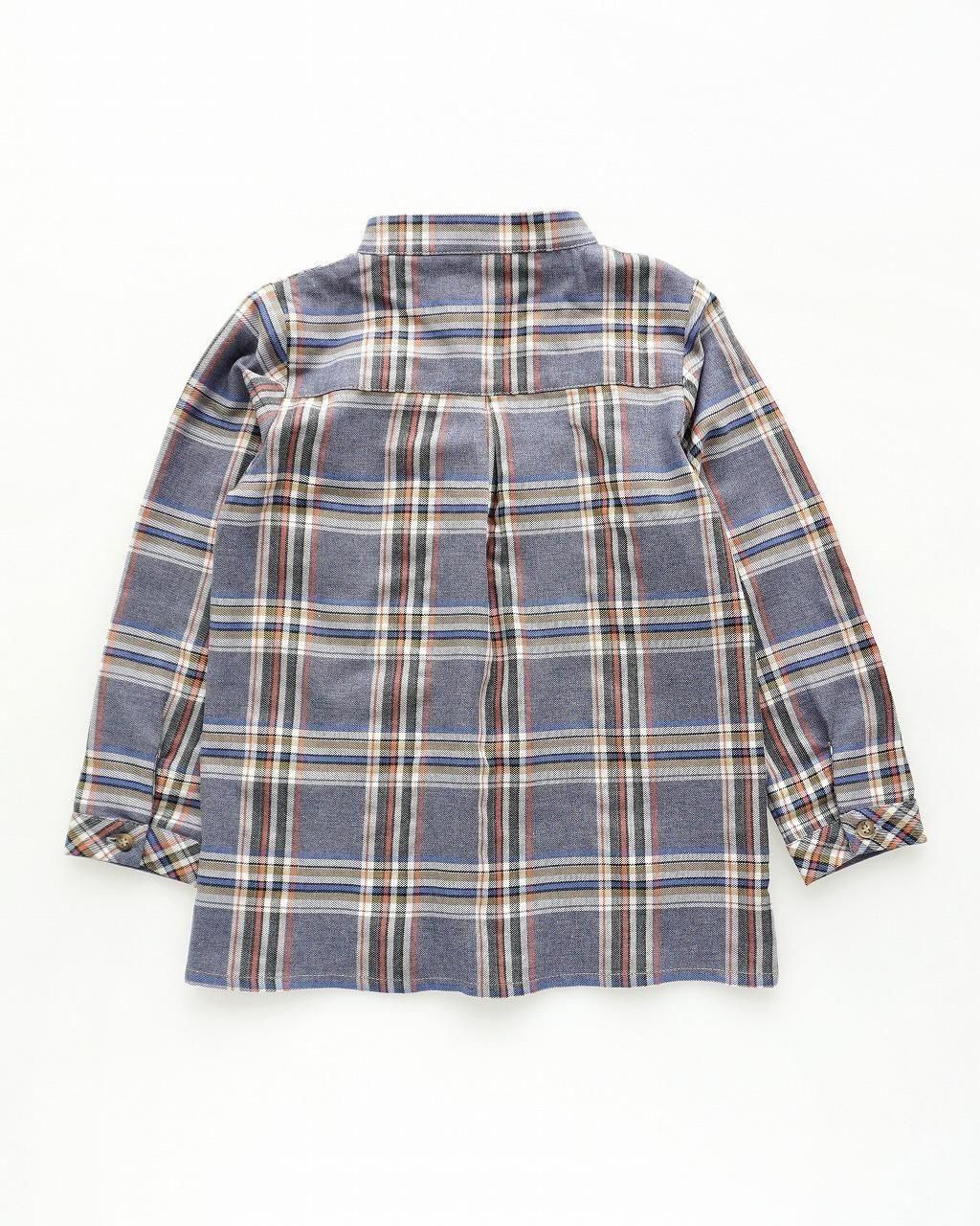 杢の入ったやわらかなインディゴカラーに、オレンジ、ベージュ、ホワイトなどの大き目チェックが