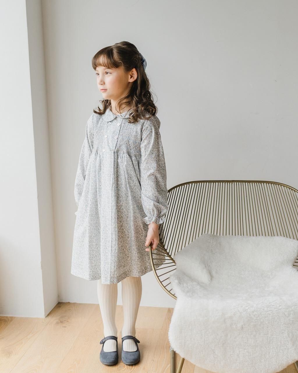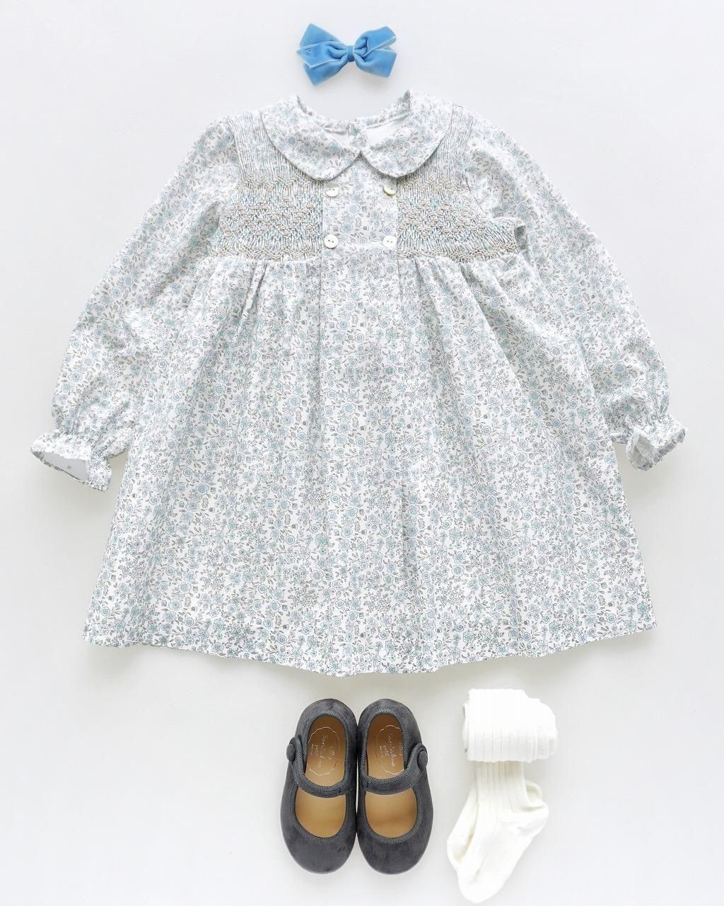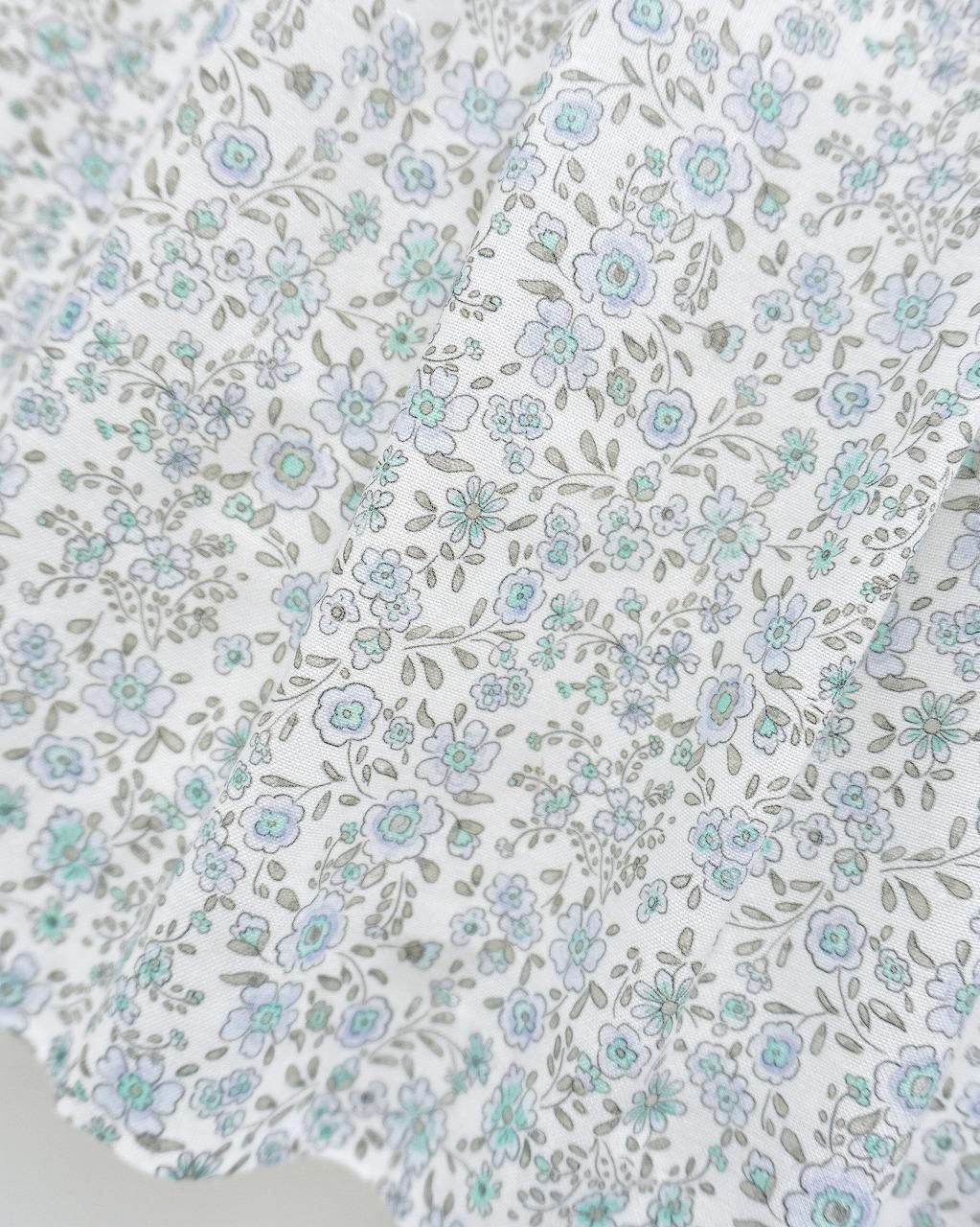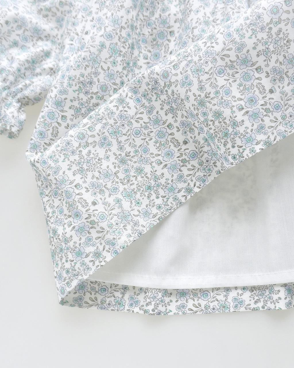 こちらのワンピースは、淡いブルーとグレージュの花柄のポプリン生地。