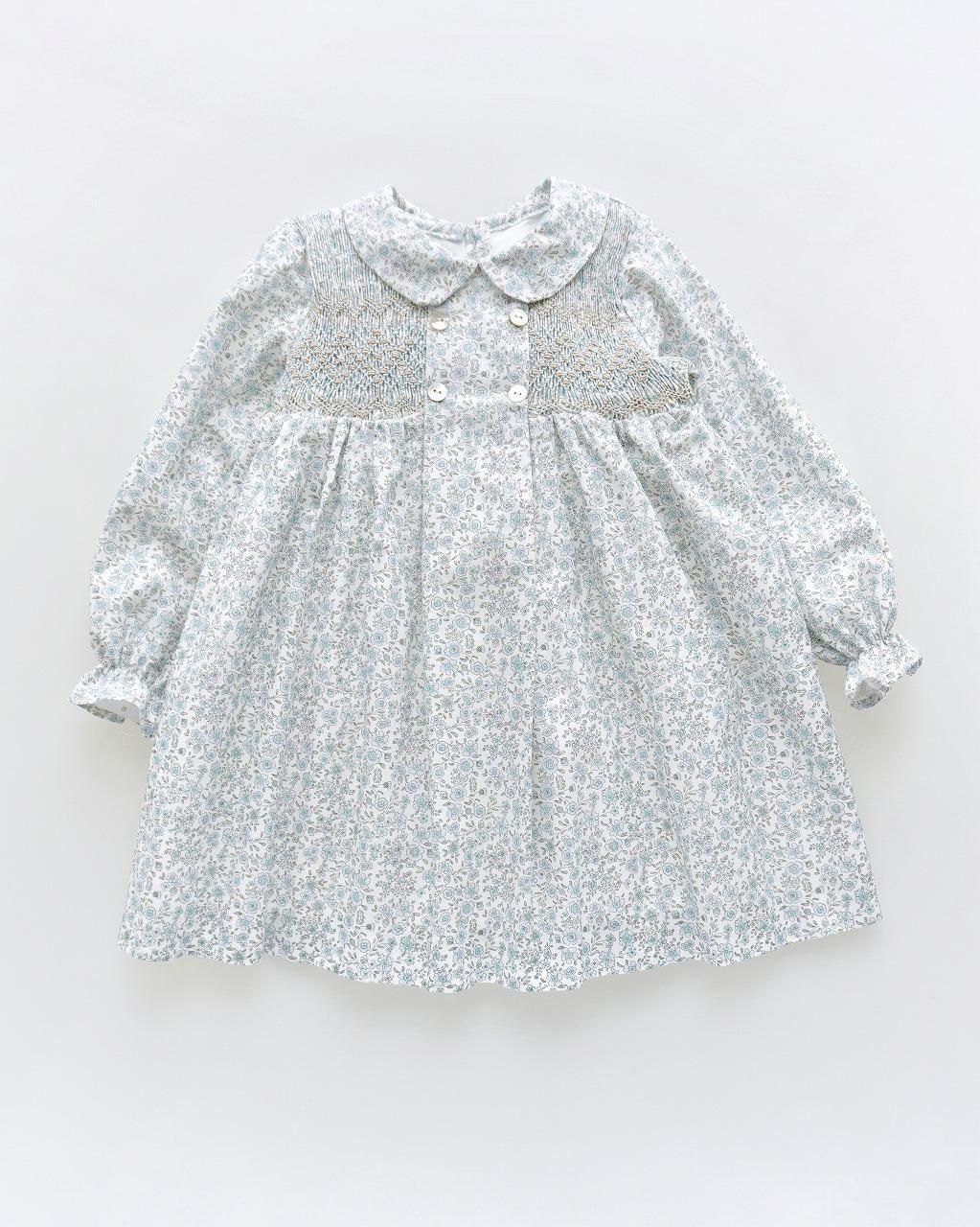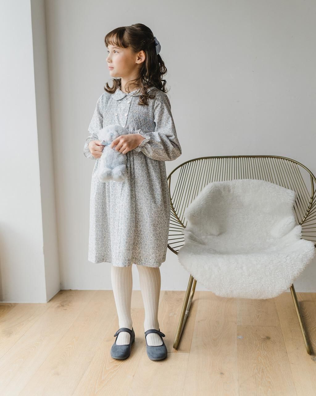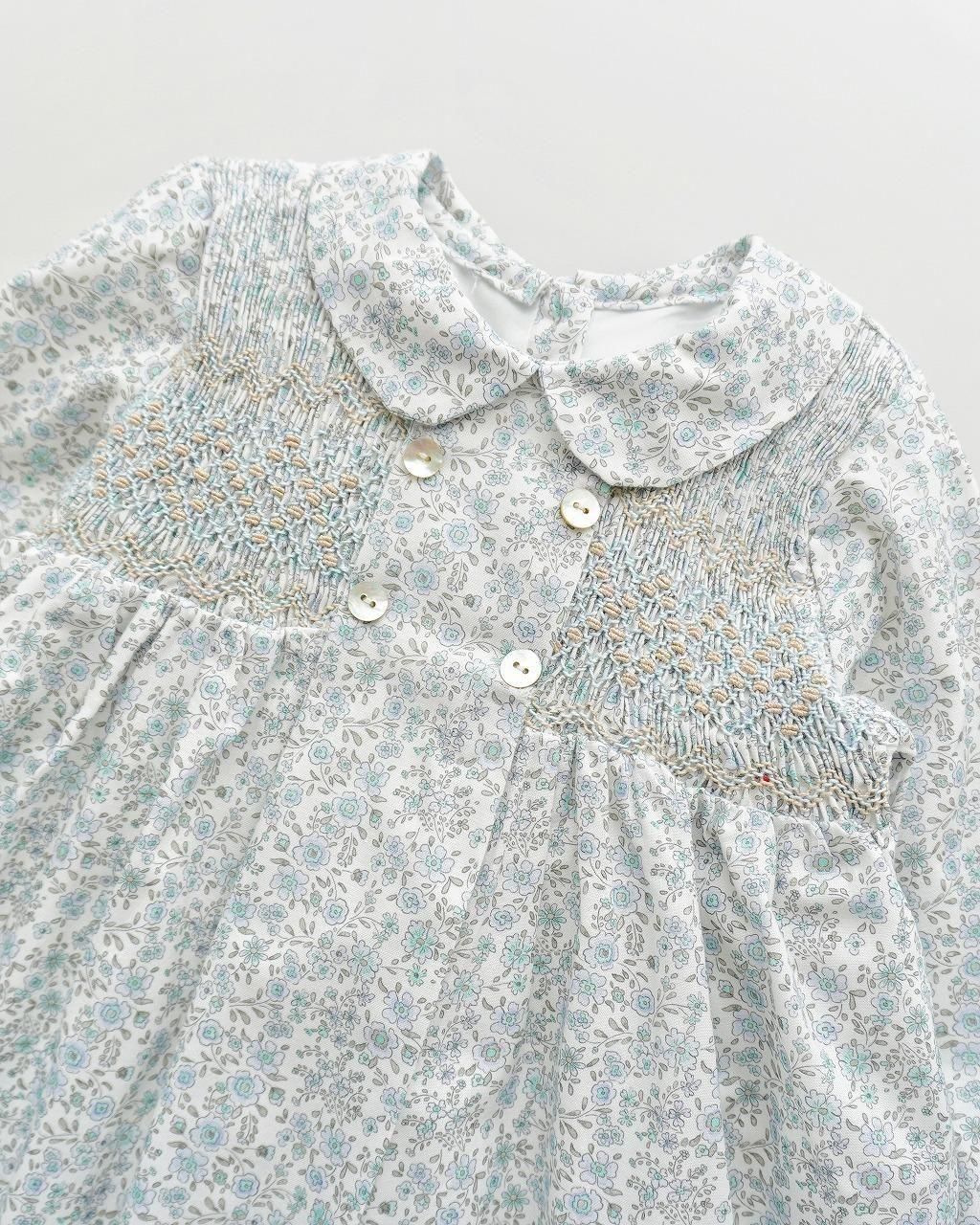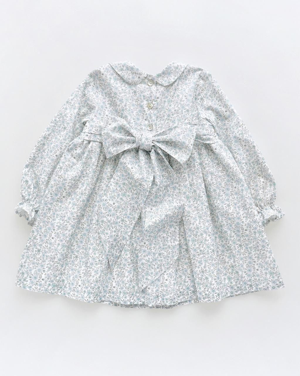 こちらのワンピースは、淡いブルーとグレージュの花柄のポプリン生地。
