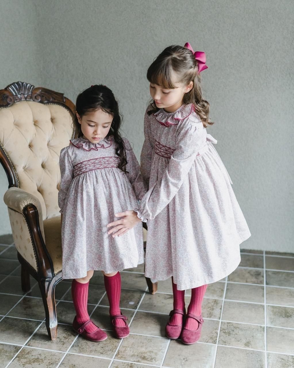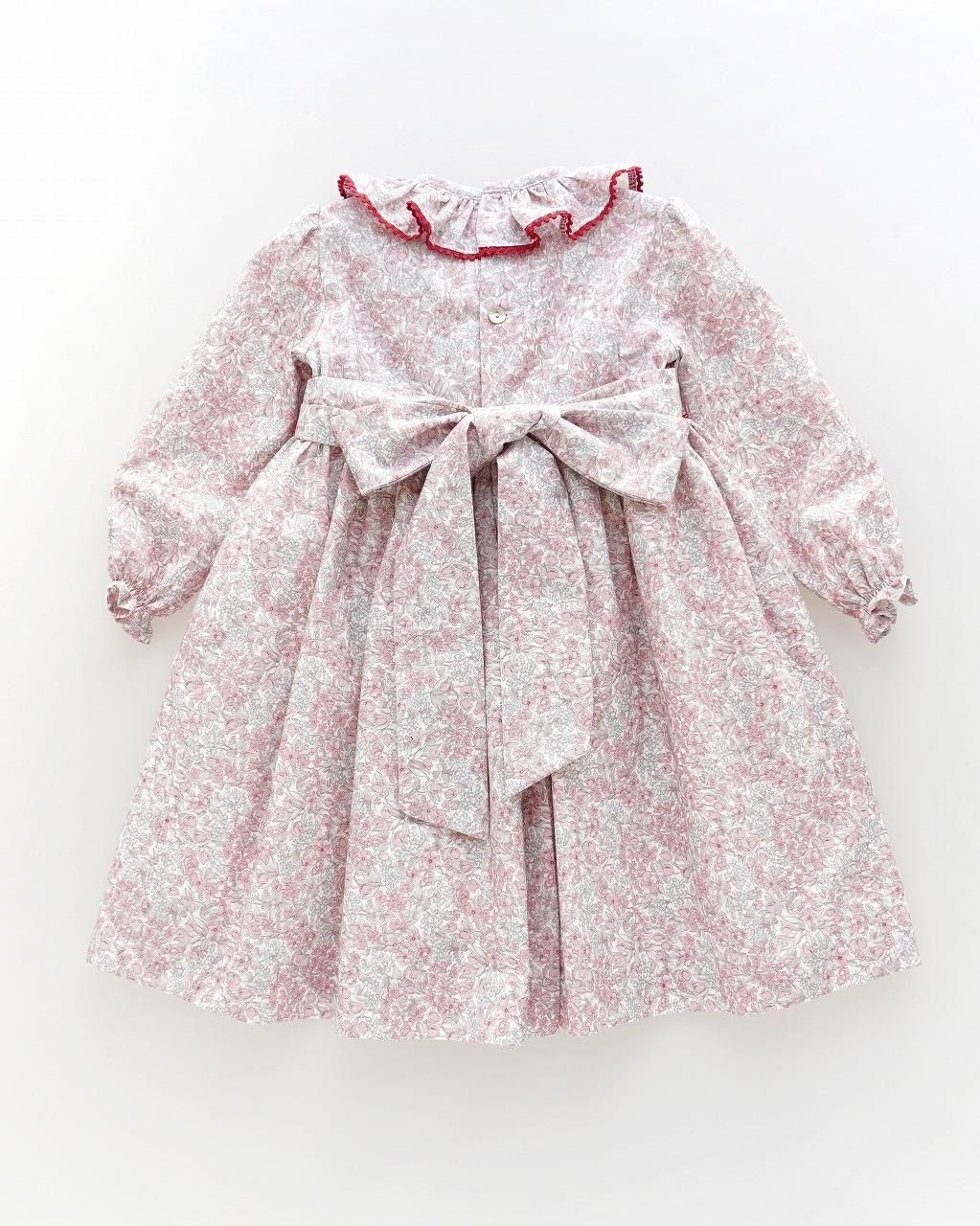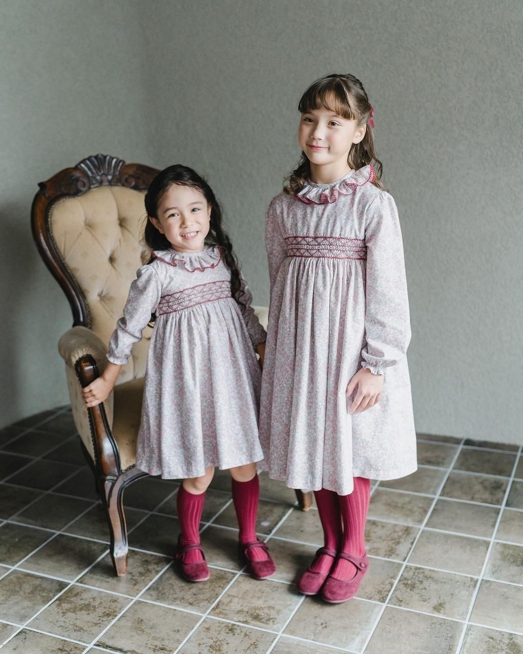 ワインカラーの花柄が秋冬らしい印象の長袖のスモッキングワンピース。