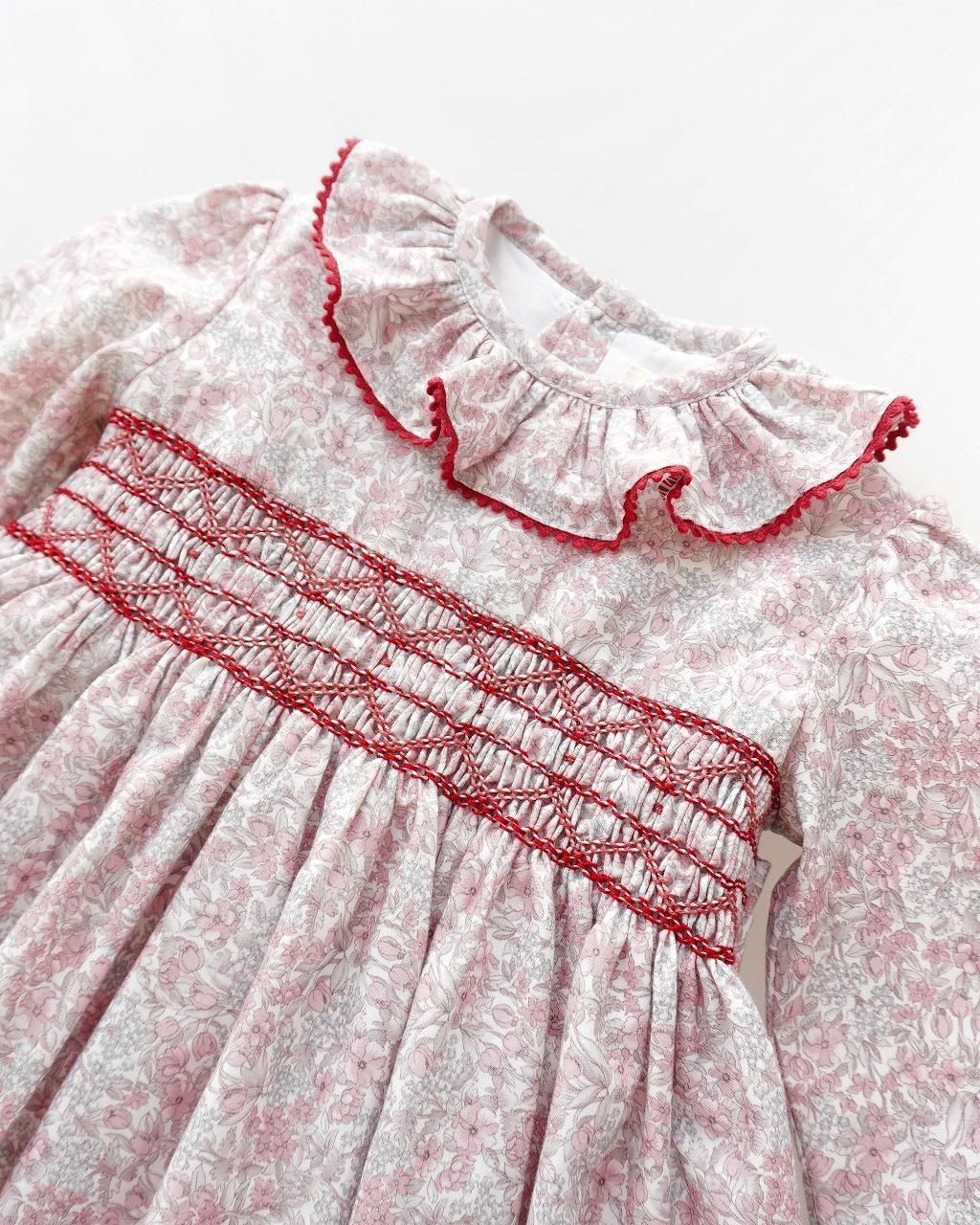 合わせるのは、真紅のスモッキング刺繍と、ポコポコとしたリックラックテープ。