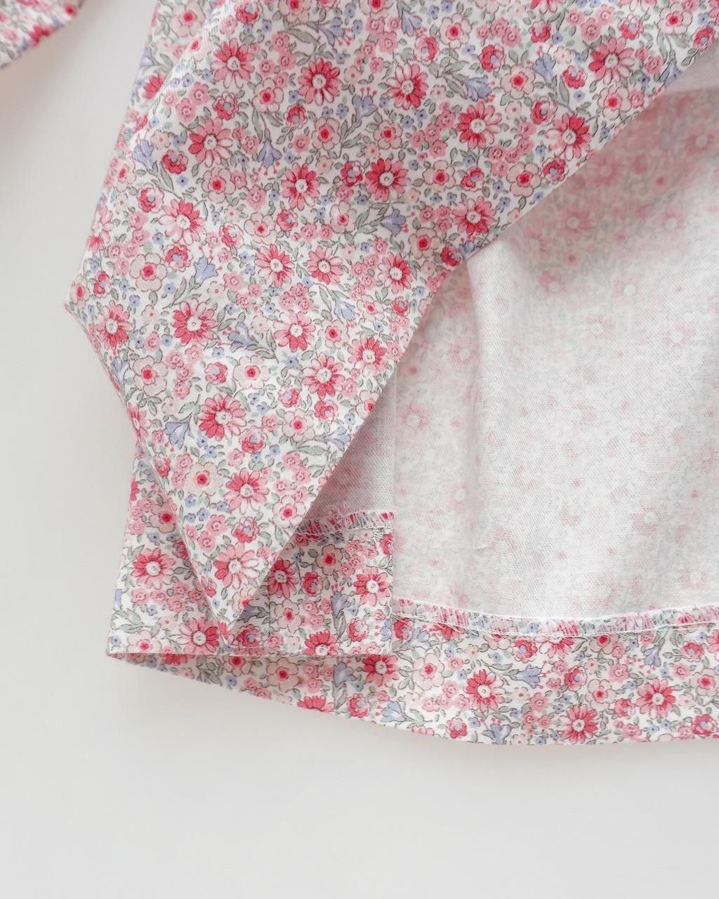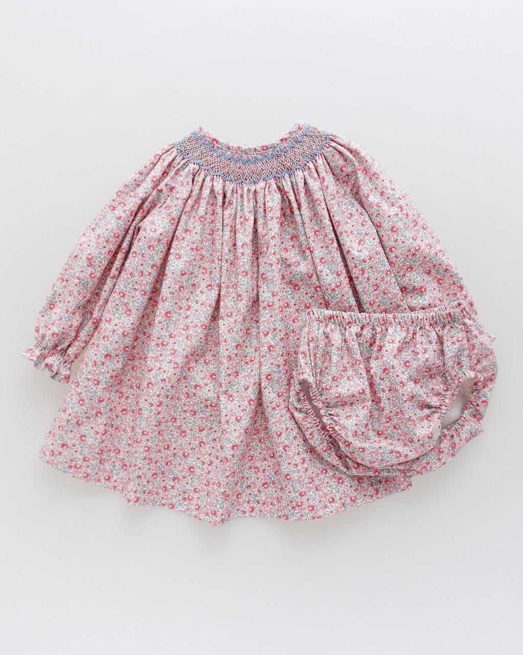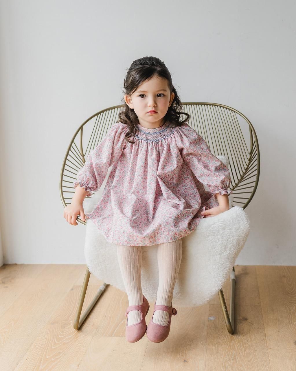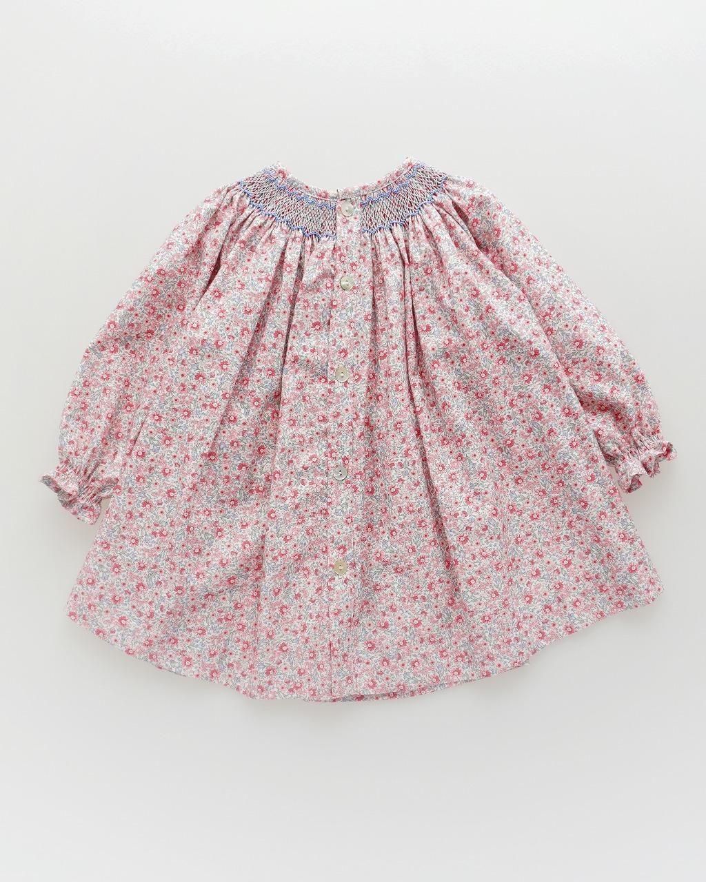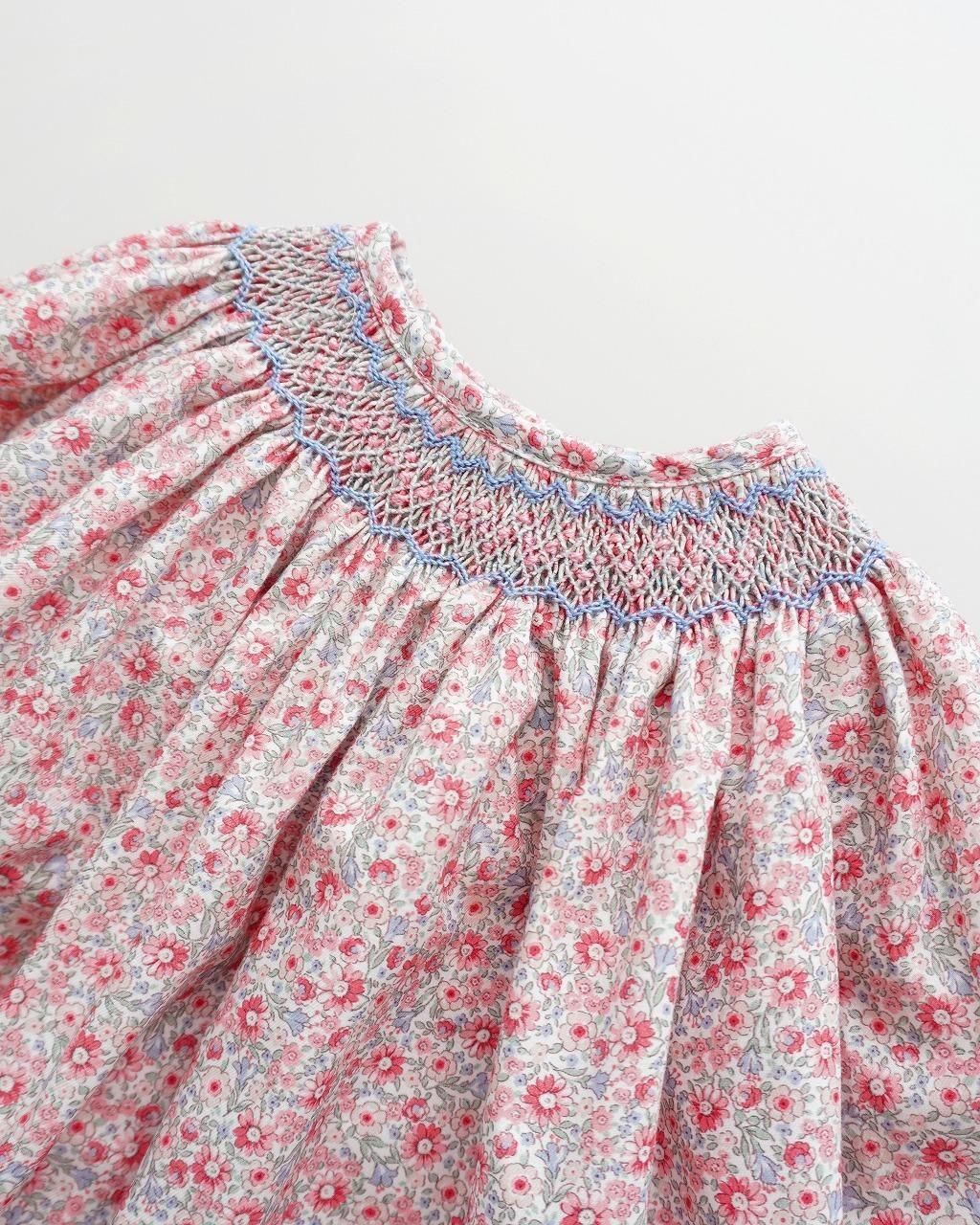 首回りに360度ぐるりとハンドスモッキングがあしらわれており、
