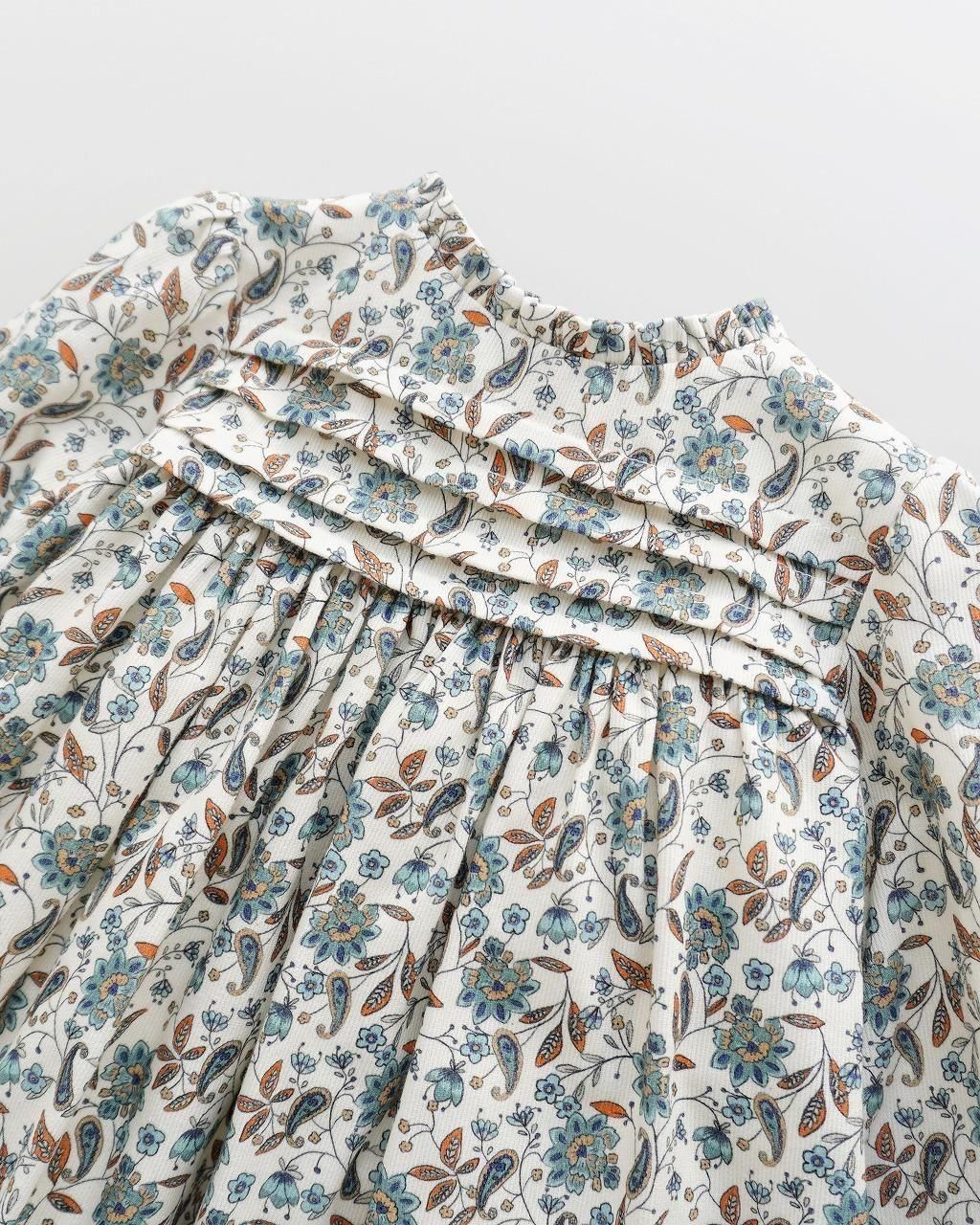 低めのフリルスタンド襟に、身頃と袖のタックデザインが洗練された印象です。