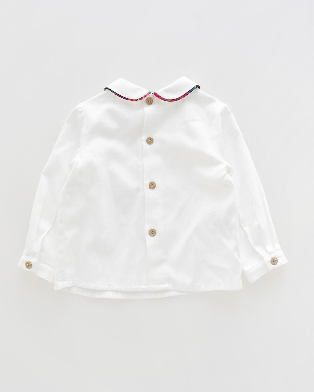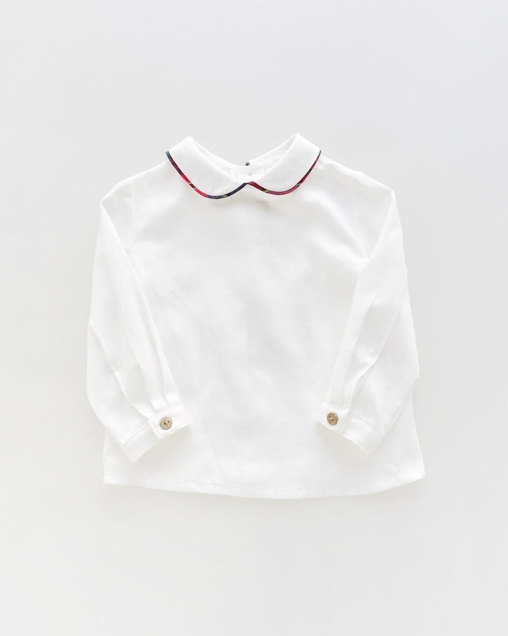シャツはシンプルなホワイト生地に、共布パイピングの丸襟がキュート。